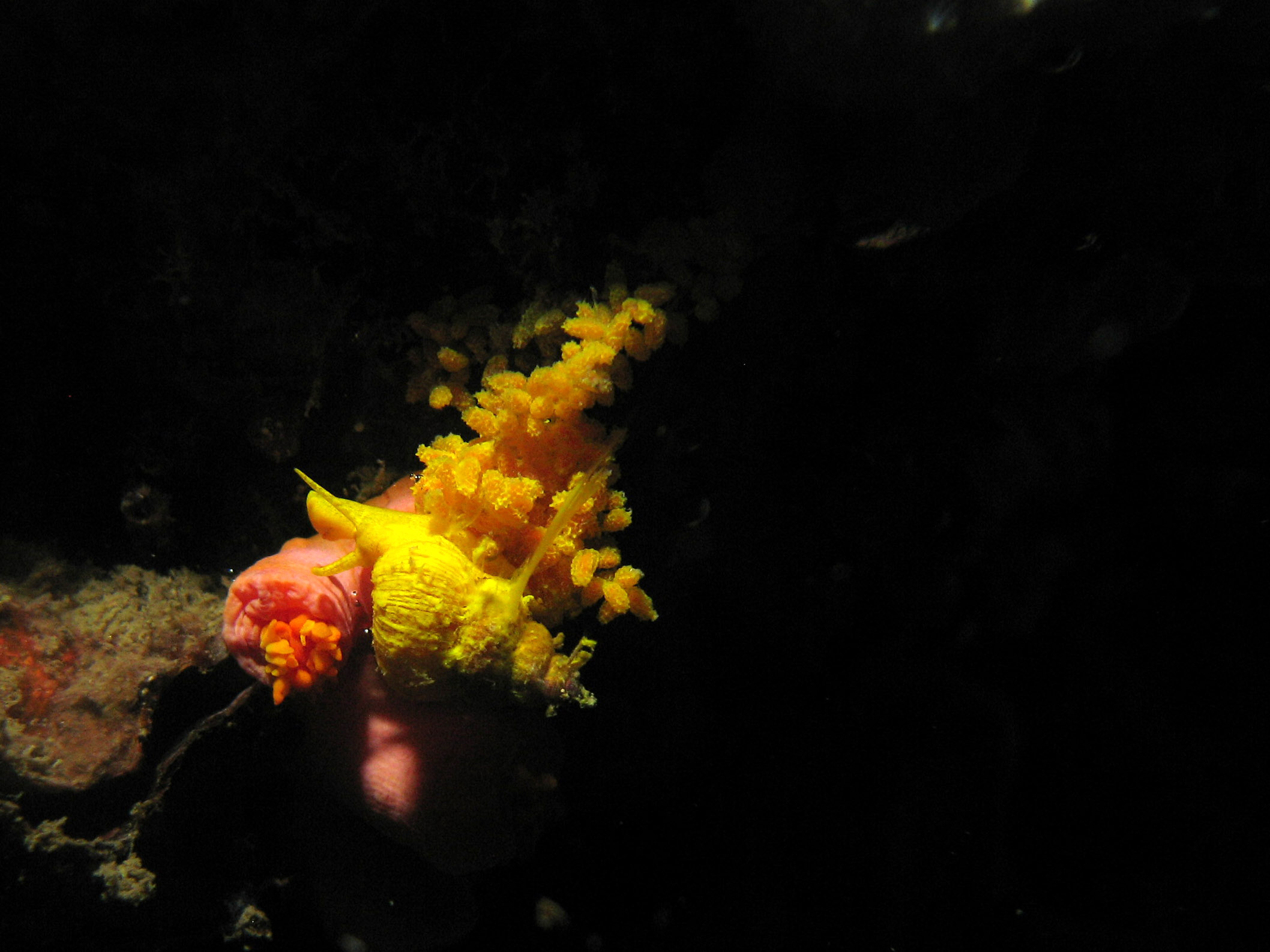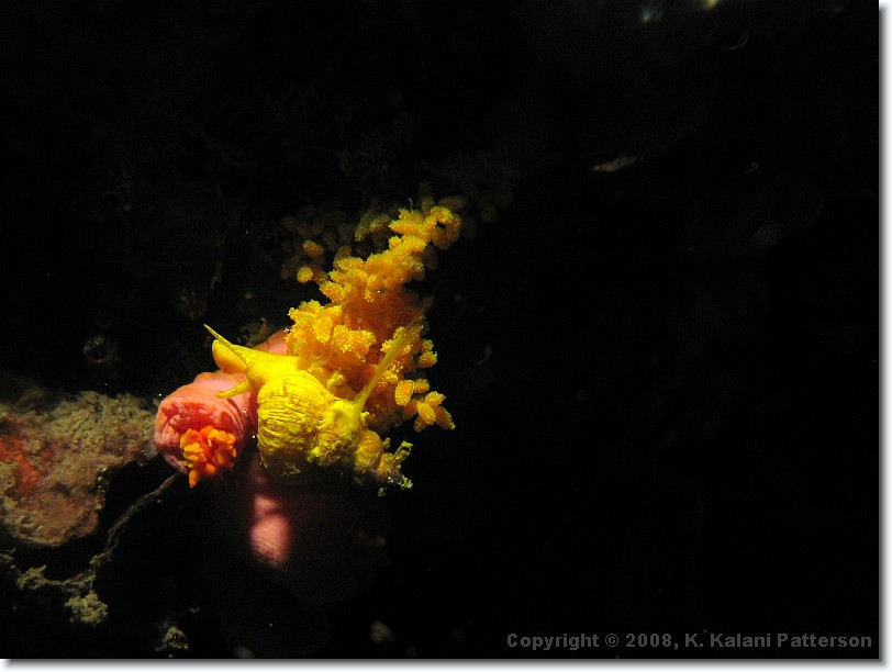 IMG_8254-crop * Golden Wentle Trap Snail (Epitonium billeeanum) dining on Coral (Tubastraea cf. faulkneri) and laying eggs * 2280 x 1710 * (590KB)